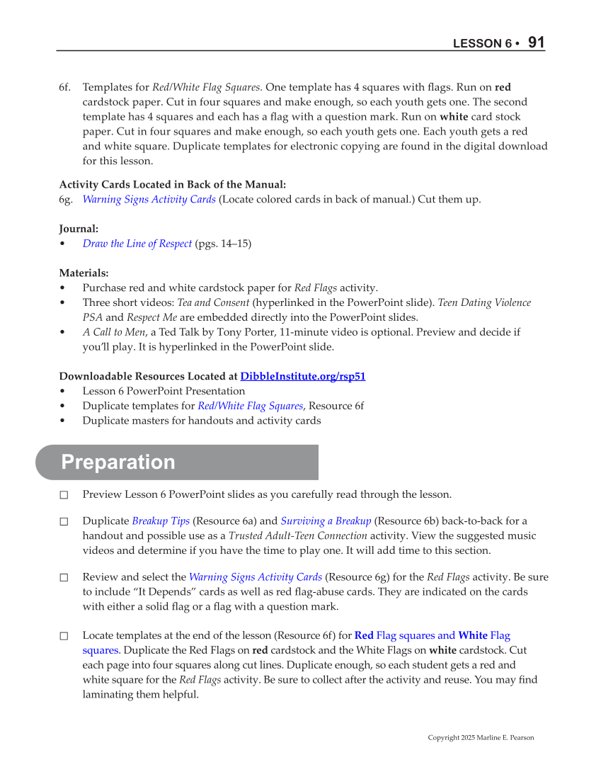 ⃞ Review and select the Warning Signs Activity Cards (Resource 6g) for the Red Flags activity. Be sure